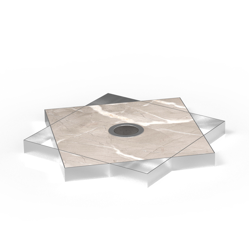 Este elemento forma una estrella de ocho puntas que mezcla dos materiales, la piedra natural y el acero.